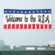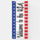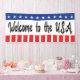 Herzlich willkommen auf dem US-Banner mit US Flagge in Rot, Weiß und Blau zum Empfang internationaler Besucher in den Staaten.