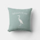 Dieses einfach entworfene, heronbezogene Outdoor-Kissen ist mit einem silhouettierten Heron (oder egret) stehenden Schreiner mit einem Bein gebogen, mit anpassbarem gebogenem Kissen, der "Welcome to the river" über der Grafik, dem See- oder Regionennamen unterhalb der Grafik auf der Vorderseite zeigt - auf der Rückseite des Kissens zeichnet sich ein Muster aus kleineren heronischen Silhouetten mit grünen Zweigen - Text und Grafiken sind weiß auf einem kräftigen, hell grau-grau-aquamarinen Hintergrund Katz_d_zynes
