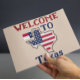 Feiern Sie den Geist des Lone Star Staat mit diesem kühnen "Welcome to Texas" Design. Mit einer patriotischen Texas-Landkarte voller US Flagge kombiniert diese Grafik Staatsstolz mit amerikanischer Symbolik. Ideal für die texanische Dekoration, Souvenirs oder Werbematerial, den warmen Beige-Hintergrund und die klassische Typografie verleihen dem Hotel ein zeitloses, einladendes Ambiente.