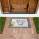 Künstlerisch und modern gestaltete Türmatten zeigen den zentrierten Text "Welcome to our nest" auf grauem Hintergrund. Weißer Bärengelb