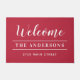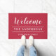Elegante und zeitlose benutzerdefinierte Türmatte bietet "Welcome" in der Kalligraphie-Skripterstellung mit dem Nachnamen Ihrer Familie und Ihrer Zuhause-Adresse personalisiert in Weiß mit schlichten Stripakzenten. Beachten Sie, dass die Farben für roten Hintergrund und weißen Text so geändert werden können, dass sie mit der Veranda oder der Eingangstür abgestimmt werden.