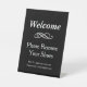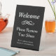 Benutzerdefiniertes Kartenzeichen, das während der Zuhause-Shows angezeigt wird, zeichnet sich durch ein klassisches Schwarz-Weiß-Design aus: "Willkommen, entfernen Sie bitte Ihre Schuhe" mit benutzerdefiniertem Text für Gäste Wi-Fi-Informationen.