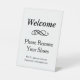Benutzerdefiniertes Kartenzeichen, das während der Zuhause-Shows angezeigt wird, zeichnet sich durch ein klassisches Schwarz-Weiß-Design aus: "Willkommen, entfernen Sie bitte Ihre Schuhe" mit benutzerdefiniertem Text für Gäste Wi-Fi-Informationen.