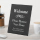 Benutzerdefiniertes Kartenzeichen, das während der Zuhause-Vorführungen angezeigt wird, weist ein klassisches Schwarzweiß-Design auf: "Willkommen, entfernen Sie bitte Ihre Schuhe" mit eigenem Text für Gäste Wi-Fi Informationen.
