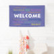 Ein lustiges Design, das in vielen Sprachen wie Spanisch, Japanisch und Französisch willkommen heißt, in verschiedenen Farbtönen wie Weiß, Gelb und Rosa vor einem lila Hintergrund
