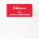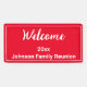 Dieses Wiedersehen-Banner der hellroten Familie hat einen weißen Bildschirmtext. Sie können den Text bearbeiten, um eine benutzerdefinierte Nachricht anzuzeigen. Die oberste Zeile des Textes ist ein Skript, das aktuell heißt Willkommen. Die Mittellinie ist für das Jahr oder Datum. Die letzte Zeile bezieht sich auf den Ereignisnamen.