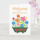 Eine pretty'Welcome Karte mit einem FensterBox voll von hell farbigen Blumen, von einer handgemalten Papiercollage durch Judy Adamson. Zusammenpassende Geschenke und andere Grußkarten mit diesem entwerfen auch verfügbares in meinem Speicher.