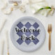 Fügen Sie Ihren Mitarbeitern mit diesen Tellern eine persönliche Nachricht zu einem Willkommensfrühstück oder Snack hinzu. Diese Teller zeichnen sich durch ein ausgeklügeltes und berufliches blaues Rautenmuster aus. Die Diamanten zeigen ein gefliestes Mosaik-Design vor einem hellblauen grauen Hintergrund, der auf Wunsch angepasst werden kann. Die Worte "Welcome Back" erscheinen in der Mitte und können leicht personalisiert werden.