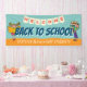 Willkommen Ihre Schüler zurück zur Schule mit diesem skurrilen Banner. Das Design ist mit niedlichen Cartoon-Illustrationen eines Jungen, der Bücher trägt, und eines Mädchens, das ein Buch liest, ausgestattet. Personalisieren Sie sich mit dem Namen der Schule.