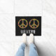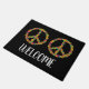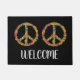 Eine bunte Fußmatte der friedlichen Hippieart, die bunte Friedenszeichenillustration gegen einen flippigen schwarzen kundengerechten farbigen Hintergrund mit Willkommensschild kennzeichnet. Homely, Sechziger bunt und künstlerische willkommene Türmatte perfekt für Ihr Haus.