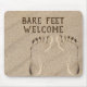 Bare Fußabdrücke im Strand Sand mit Willkommensschild.