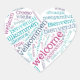 Herzförmiges Willkommensdesign, Sprichwort WELCOME in über 60 verschiedenen Sprachen. Das Bild ist für eine Vielzahl von Produkten verfügbar. Das Hinzufügen von Text ist optional.