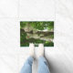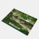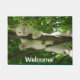Ein weißes Kätzchen auf einem Baumzweig inmitten üppiger grüner Vegetation. Das Fell des Kätzchens ist rein weiß und kontrastiert mit seiner rosa Nase und den Pfoten. Seine Augen sind auffallend gelb. Das Kätzchen befindet sich auf einem robusten, braunen Zweig, der von Blätter umgeben ist und einen natürlichen Rahmen schafft. Das Wort "Willkommen" wird in fett- und weißen Buchstaben am unteren Rand des Bildes geschrieben. Die Beleuchtung ist sanft und natürlich, was die Kätzchen und das Grün der Blätter unterstreicht. Die Komposition ist ausgeglichen, das Kätzchen als Mittelpunkt, umgeben von den natürlichen Elementen des Baumes.