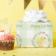 Destei's watercolor illustration featuring a yellow baby chick nestled inside a willow wreath. The wreath is decorated with colorful pastel Easter eggs, creating a cute Easter scene. There is also a personalizable text area that now reads: "Happy Easter!". The background is a green gingham pattern.