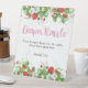 Ein beersüßes Baby ist unterwegs! Dieses Babyduschenschild "Diaper Raffle" ist mit niedlichen Erdbeeren, weißen Blume und Grünpflanzen versehen. Ergänzt wird es durch eine lustige Handschrift Stil Typografie und Sie können den Text und grafische Platzierung Details an Ihre spezifischen Bedürfnisse anpassen.