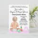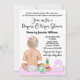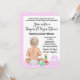 Windeln und wischen Baby Dusche Einladung mit einem hübschen Baby Mädchen mit Spielzeug auf einem niedlich rosa Punkt Hintergrund.