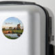 Runder Andenken-Foto-Magnet mit einer Windmühle neben einem kleinen Graben mit einer Brücke am Rande einer großen Wiese in der niederländischen Landschaft bei Sonnenuntergang in Aarlanderveen, Niederlande mit dem Text: 'Holland'.