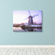 Leinwand Landschaftsbild einer Windmühle während eines lila Sonnenaufgangs im Winter mit einer dünnen Schnee- und Eisschicht auf dem Wasser auf dem UNESCO-Weltkulturerbe Kinderdijk in den Niederlanden.