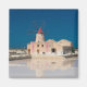 Souvenir Foto Magnet mit dem Salzmuseum mit einer traditionellen Windmühle mit rotem Dach und Reflexion in den Salzpfannen in der Salina von Mozia an der Westküste Siziliens zwischen Trapani und Marsala.