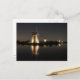 Postkarte einer Landschaft mit mehreren Windmühlen, nachts beleuchtet, mit Reflexion im stillen Kanalwasser in Kinderdijk, Niederlande.