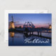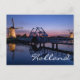 Postkarte von zwei beleuchteten Windmühlen und einer Zugbrücke mit Reflexion im Wasser des Kanals im letzten Licht bei Sonnenuntergang in Kinderdijk in den Niederlanden mit dem Text: 'Holland'.