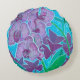 Rundkissen mit handgezeichneter Blumenmalerei, Innengarten - wunderschöne orchid Blume, Dreieck-Blätter von Oxalis und einige Sukkulente im Hintergrund. Farbpalette: lila, violett, lila, lavender, aquamarin, grün und blau © Julia Khoroshikh 2021 #floralprints #floraldecor #botanicaldecor #floralpillows #throwpillows #hometextiles