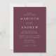 Minimalistische, moderne Hochzeitseinladung mit Ihren Hochzeitsdetails in weißer Schrift mit Kalligraphie-Schriftzeichen-Akzenten mit einem lila Hintergrund oder einer Farbe Ihrer Wahl. Die Rückseite der trendigen Hochzeitseinladung zeigt Ihr Foto der vertikalen Verlobung. Entworfen, um mit unserer Hochzeitskollektion "Moderne Elegance" zu koordinieren.