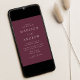 Minimalistische, moderne Hochzeitseinladung mit Ihren Hochzeitsdetails in weißer Schrift mit Akzenten der Kalligraphie. Der lila Weinhintergrund kann in eine Farbe Ihrer Wahl geändert werden. Entworfen, um mit unserer Hochzeitskollektion "Moderne Elegance" zu koordinieren.