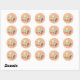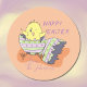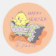 Ein niedlicher, hellorangefarbener Rundaufkleber mit einer niedlichen Hühnerbrüte aus einem geschmückten Ei . Der Text lautet "Happy Oaster". Personalisieren Sie es mit dem Namen Ihrer Familie . Ideal, um als Umschlag Aufkleber zu dienen oder Geschenke zu dekorieren. © ArianeC Illustrations-Alle Rechte vorbehalten
