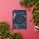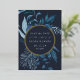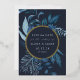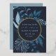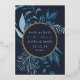 Unsere Winter Azure Save the Date-Karte umgibt Ihre Hochzeitsdetails mit einem runden Rahmen aus lebendigem wasserfarbenem Blattwerk in winterlichen Schattierungen staubblauer Farbe, bestickt mit Goldfolie auf einem reichen Mitternachtsblauen Hintergrund. Eine moderne und Bio Wahl für Winterhochzeiten mit kunstvoll bemalten botanischen Elementen.