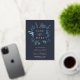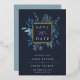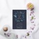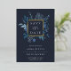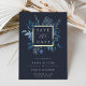 Unsere Winter Azure Hochzeit speichert das Datum umrahmt die Worte "Save the Date" mit einem eleganten quadratischen Rahmen von üppigem wasserfarbenem Blattwerk in winterlichen Schattierungen von staubblauem Blau, mit echter Goldfolie auf einem Mitternachtsblauen Hintergrund. Modernes und elegantes Ambiente im botanischen Trend für Hochzeiten im Winter oder Frühling in Blau und Weiß.