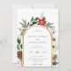 Eleganter Winter botanische Blumen und Blätter, Hochzeitseinladung. Bogenrahmen mit goldenem Akzent und koordinierender grüner Farbunterlage. Die Einladung bietet schicke Typografie Design Stil Mix aus Kalligraphie und fett-Typ.