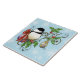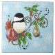 Niedliches Chickadee, das im Winter auf einem Baumarm sitzt und Schneeflocken herumfallen. Weihnachtsschmuck hängt von dem Baumzweig ab, auf dem die Kiche sitzt.