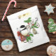 Niedliches Chickadee, das im Winter auf einem Baumarm sitzt und Schneeflocken herumfallen. Weihnachtsschmuck hängt von dem Baumzweig ab, auf dem die Kiche sitzt.