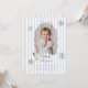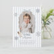Celebrate your little one's Winter and Christmas Goose themed first Birthday with this easy to edit template. Featuring a playful wavy bow border with your own custom photo inside. There is a sweet little goose wearing a Santa hat and with a blue bow on it in the corner, along with 'One silly goose' typography. There are snowflakes around and a blue stripy background.