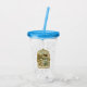 Dieser Acryl-Drink-Krüger mit Strohdach und Deckel hat eine Winterlandzene mit einem Haus durch einen Schneestrom und einem Vogel auf einem Zweig in einem goldenen und weißen Vogelkäfig.