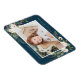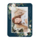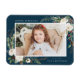 Eleganter Foto-Magnet mit Ihrem Lieblings-Foto gerahmt von Bouquets von Elfenbein Aquarell-Blume, üppig grünes Blattwerk, Kiefernzapfen und Heilige Beeren vor einem marinen Hintergrund. Personalisieren Sie die Urlaubsmagnete, indem Sie Ihren Namen und einen persönlichen Gruß hinzufügen.
