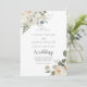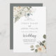 Diese blumengeschmückte, informelle Hochzeitseinladung eignet sich ideal für eine elegante Hochzeit. Das schlichte Design besticht durch weiße Blume mit Wintergrün und Eukalyptus-Blätter und ein modernes Landgefühl.