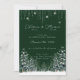 Hübsche Hochzeitseinladung mit schönem dunkelgrünem Hintergrund, mit zarten Schneeflocken, weißen Winterbäumen, Pinienbäumen und hängenden weißen Lichtern.