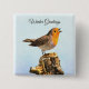 Winter Greetings text you can customize. Robin singing, on a small tree stump.