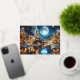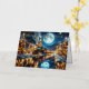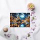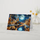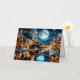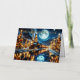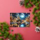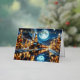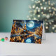 Ein schönes Aquarellbild einer nächtlichen Winterszene mit einer Vintagen Dampflokomotive, die an einer mit festlichen Weihnachtsbeleuchtung geschmückten Station ankommt. Schneedecke auf dem Boden und den Dächern, und die Kulisse bietet mächtige Berge unter einem Sternenhimmel mit Vollmond. Das warme Licht des Zugscheinwerfers und die funkelnden Lichter schaffen eine einladende und gemütliche Urlaubsatmosphäre, die Gefühle der Nostalgie und der Feierlichkeiten im Zusammenhang mit der Weihnachtszeit weckt.