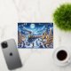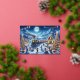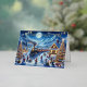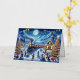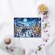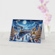 Ein schönes Aquarellbild einer nächtlichen Winterszene mit einer Vintagen Dampflokomotive, die an einer mit festlichen Weihnachtsbeleuchtung geschmückten Station ankommt. Schneedecke auf dem Boden und den Dächern, und die Kulisse bietet mächtige Berge unter einem Sternenhimmel mit Vollmond. Das warme Licht des Zugscheinwerfers und die funkelnden Lichter schaffen eine einladende und gemütliche Urlaubsatmosphäre, die Gefühle der Nostalgie und der Feierlichkeiten im Zusammenhang mit der Weihnachtszeit weckt.