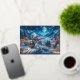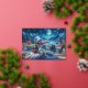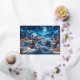 Ein schönes Aquarellbild einer nächtlichen Winterszene mit einer Vintagen Dampflokomotive, die an einer mit festlichen Weihnachtsbeleuchtung geschmückten Station ankommt. Schneedecke auf dem Boden und den Dächern, und die Kulisse bietet mächtige Berge unter einem Sternenhimmel mit Vollmond. Das warme Licht des Zugscheinwerfers und die funkelnden Lichter schaffen eine einladende und gemütliche Urlaubsatmosphäre, die Gefühle der Nostalgie und der Feierlichkeiten im Zusammenhang mit der Weihnachtszeit weckt.