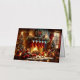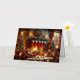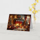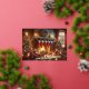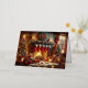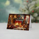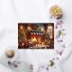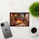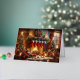Ein schönes Aquarellbild einer gemütlichen Weihnachtslandschaft in einem Raum. Über dem Kamin hängt ein beleuchteter Kamin mit Strümpfen, ein geschmückter Weihnachtsbaum zu den links, und ein Fenster zeigt, dass es draußen schneit. Verschiedene Weihnachtsdekorationen und -geschenke sind auf dem Boden verteilt, was eine warme und festliche Atmosphäre schafft.