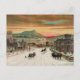 Eine Winterszene zeigt Pferd gezeichnet Schlitten, die eine schneebedeckte Straße hinunter gleiten und Menschen und Hunde die ruhige Landschaft genießen. Der Himmel ist in warmen Orange- und Rosatönen gestrichen und steht im Kontrast zur winterlichen Landschaft und den Bergen im Hintergrund.