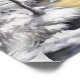 Schneebedeckte Winterwaldmalereien, die einen Sonnenuntergang einfangen, wobei eine Wasserquelle den weißen Boden, ein Haus und ein Reh hinter einem Baum überquert.