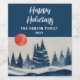 Winter Landscape Forest Navy Blue Red Moon Drawing Holiday Wine Label. Calm winter snow landscape with forest. Happy holidays in a trendy script. Personalized the text or erase it.