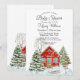 Ein bezauberndes Baby-Duschdesign mit festlichem Winterhintergrund mit Tannen und einem roten Haus in Erwartung einer kleinen Schneeflocke! Sie können diese Einladung mit Ihren eigenen Daten personalisieren!