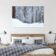 Das Bild zeigt einen dichten, schneebedeckten Wald. Große, braune Kiefernstämme stehen senkrecht, teilweise verschleiert von schneebedeckten Ästen. Der Vordergrund weist eine dicke Schneedecke auf, die sanfte Hügel und Kurven bildet. Die Farbpalette wird von Weiß und Braun dominiert und schafft eine ruhige und winterliche Atmosphäre. Die Szene ruft ein Gefühl von Ruhe und Stille hervor, das für einen schneebedeckten Wald typisch ist.