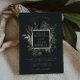 Unsere Winter Meadow Hochzeitseinladung umrahmt Ihre Namen mit einem eleganten quadratischen Rahmen von winterfarbenem Blattwerk mit goldenen Folienakzenten. Ein modernes und elegantes Ambiente im botanischen Trend für Winterhochzeiten. Farbe: Winterwiese, eine dunkle und stimmungsvolle Mischung aus gemustertem, staubigen Salbei, Farn und olivgrünem Blattwerk auf einem weichen schwarzen Hintergrund.